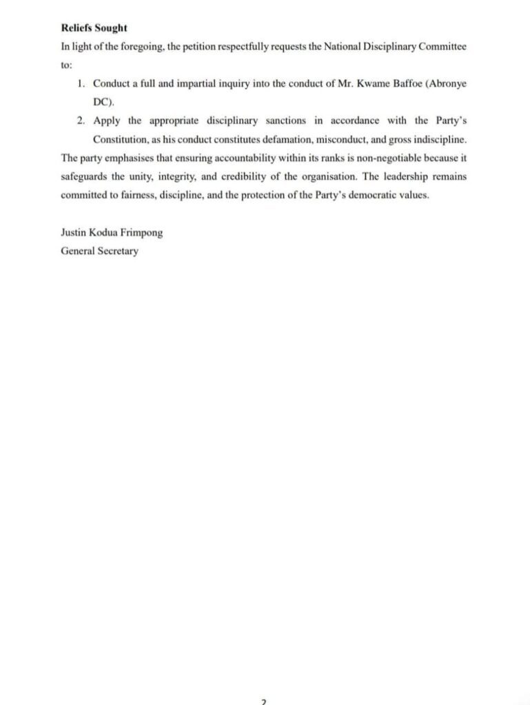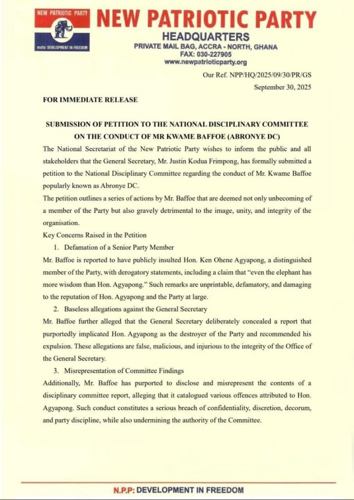 - Baseless allegations against the General Secretary Mr. Baffoe further alleged that the General Secretary deliberately concealed a report that purportedly implicated Hon. Agyapong as the destroyer of the Party and recommended his expulsion. These allegations are false, malicious, and injurious to the integrity of the Office of the General Secretary.