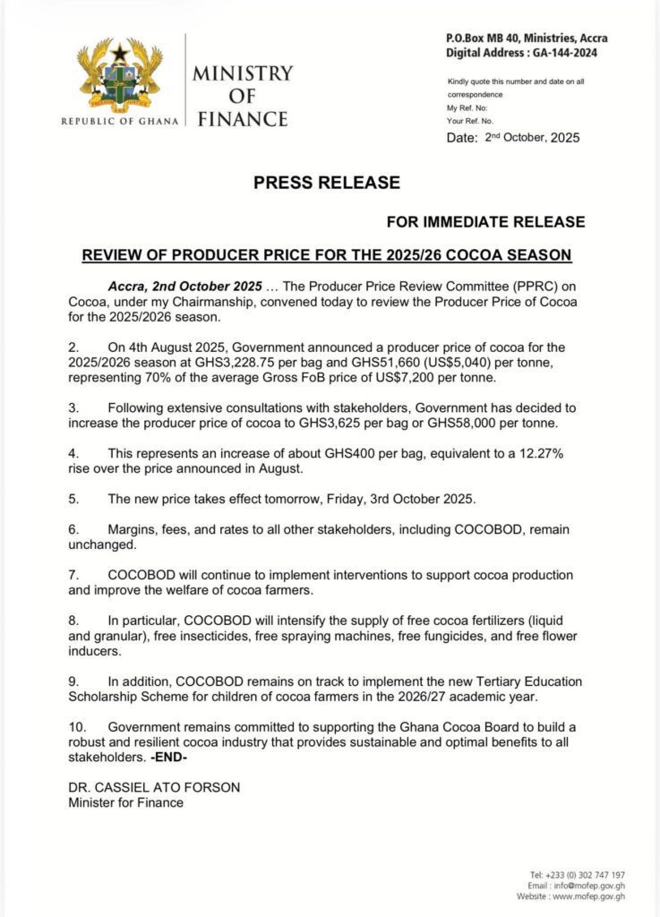 Dr Forson indicated that the new increment takes effect tomorrow, Friday, 3rd October 2025.