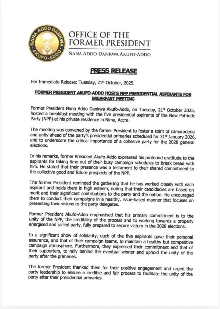 The former President made the call on Tuesday, 21st October 2025, when he hosted a breakfast meeting with the five presidential aspirants of the NPP at his private residence in Nima, Accra.