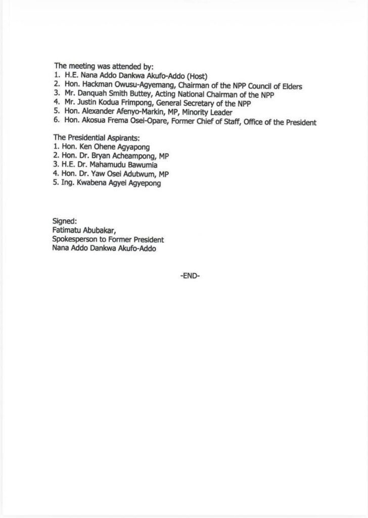 A statement issued and signed by Fatimatu Abubakar, Spokesperson to Former President Nana Addo Dankwa Akufo-Addo, indicated that the meeting was attended by H.E. Nana Addo Dankwa Akufo-Addo (Host), Hon. Hackman Owusu-Agyemang, Chairman of the NPP Council of Elders, Mr. Danquah Smith Buttey, Acting National Chairman of the NPP, Mr. Justin Kodua Frimpong, General Secretary of the NPP, Hon. Alexander Afenyo-Markin, MP, Minority Leader, and Hon. Akosua Frema Osei-Opare, Former Chief of Staff, Office of the President.