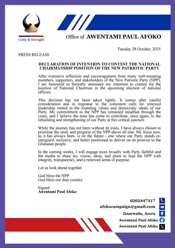 Mr. Afoko announced his decision to contest through a statement dubbed “Declaration of Intention to Contest the National Chairmanship Position of the New Patriotic Party.”