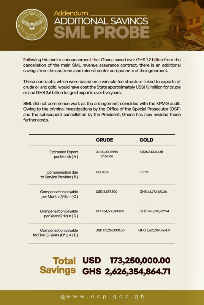 The Office of Special Prosecutor (OSP) says it has helped Ghana save more than GHS 2.6 billion and US$173 million from the cancellation of the upstream and mineral sector components of the Strategic Mobilisation Ghana Limited (SML) revenue assurance deal.