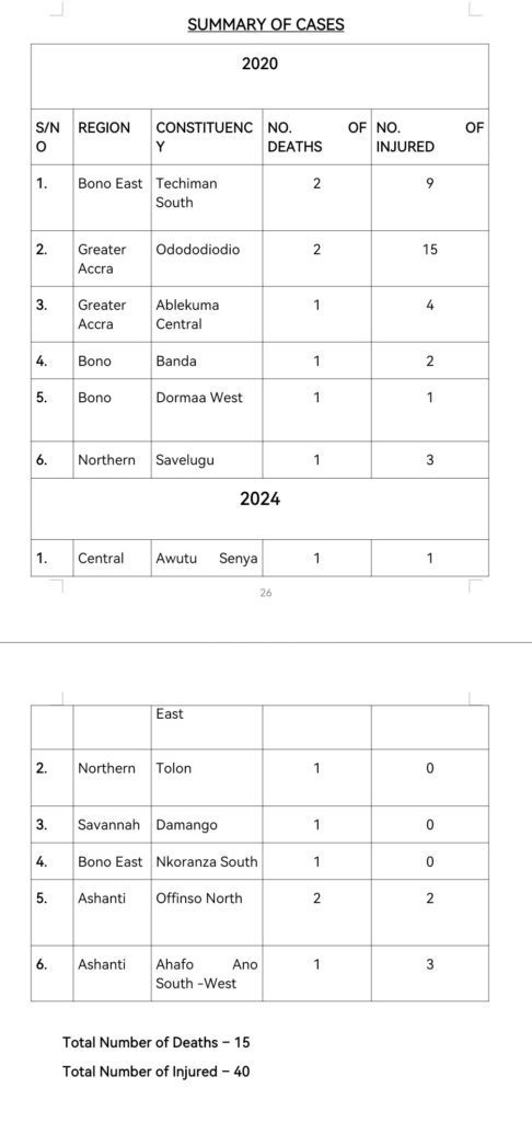 For the 2024 elections, deaths occurred in Central Region (Awutu Senya East), Northern Region (Tolon), Savannah Region (Damango), Bono East (Nkoranza South), and Ashanti Region (Offinso North and Ahafo Ano South-West).