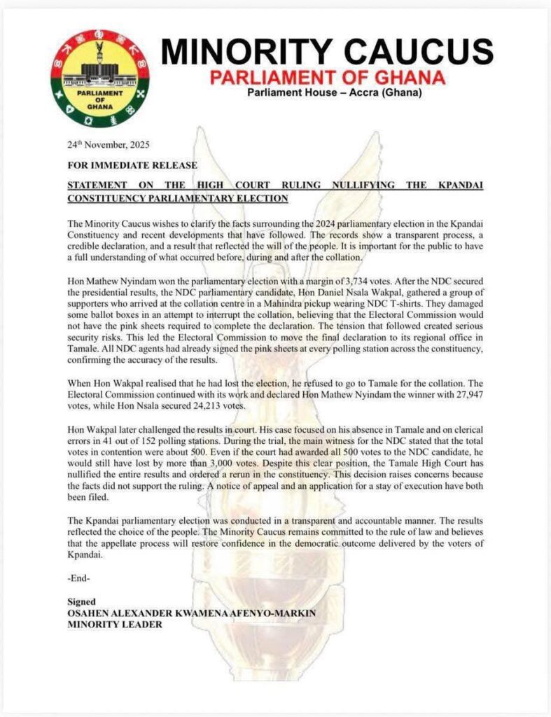 The Minority Caucus in Parliament has reacted to the order by the Tamale High Court for the Kpandai constituency elections to be rerun.