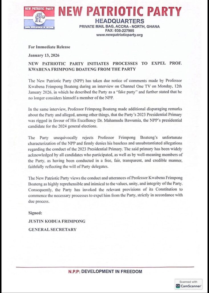 While Prof. Frimpong Boateng had already signalled his personal departure from the NPP in his interview, the party leadership is seeking a formal expulsion to protect the party’s image.