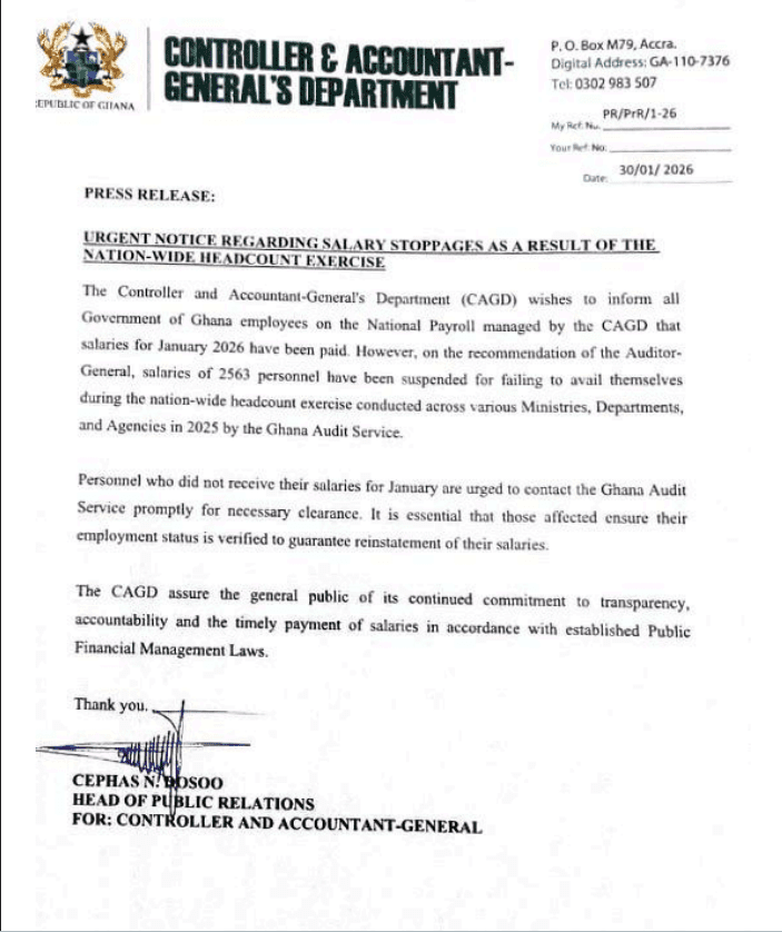 The CAGD has instructed all affected personnel to contact the Ghana Audit Service immediately to verify their employment status and complete the necessary clearance procedures, after which their salaries will be reinstated.