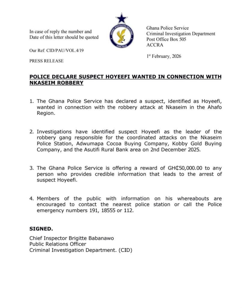 The Ghana Police Service’s Criminal Investigation Department (CID) has officially declared a suspect, identified as Hoyeefi, wanted in connection with a series of violent robberies in the Ahafo Region.
