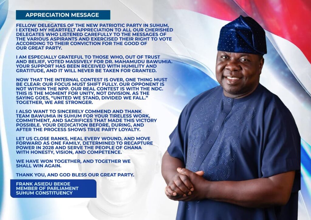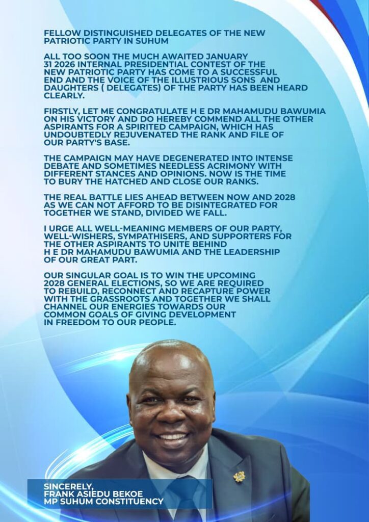 The Member of Parliament for Suhum Constituency, Hon. Frank Asiedu Bekoe, popularly known as Protozoa, has called on party delegates to rally behind Vice President Dr Mahamudu Bawumia, the winner of the January 31, 2026, presidential contest.