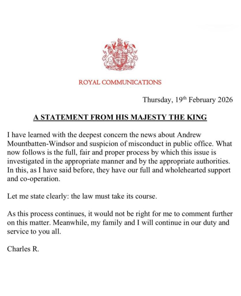“I have learned with the deepest concern the news about Andrew Mountbatten-Windsor and suspicion of misconduct in public office,” the King stated. “What now follows is the full, fair and proper process by which this issue is investigated in the appropriate manner and by the appropriate authorities.”