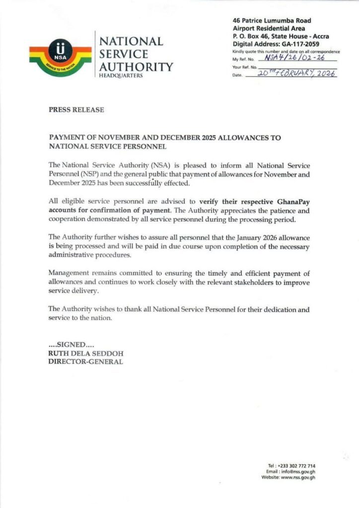 The National Service Authority (NSA) has informed all National Service Personnel (NSP) and the general public that the payment of allowances for November and December 2025 has been successfully completed.