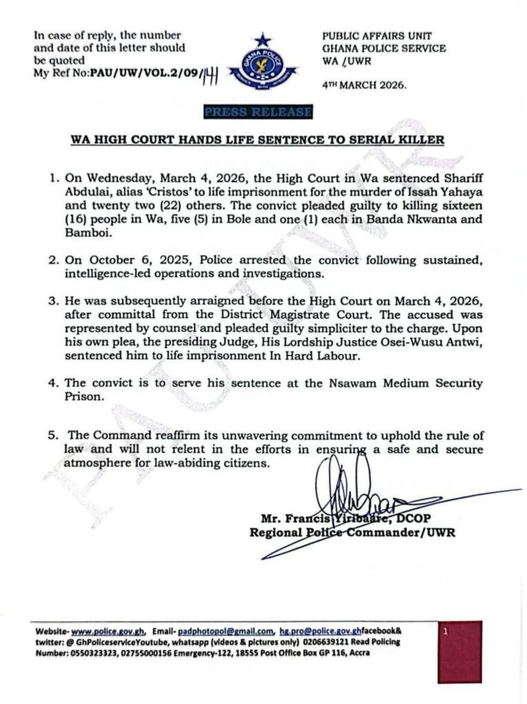In a statement following the verdict, DCOP Mr Francis Yiribaare, the Regional Police Commander for the Upper West Region, reaffirmed the Command’s commitment to the rule of law.