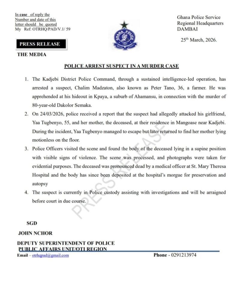 The suspect, identified as Chalim Madzaton (also known as Peter Tano), was arrested during an intelligence-led operation at his hideout in Kpaya, a suburb of Ahamansu. His arrest follows the death of 80-year-old Dakolor Semaka.