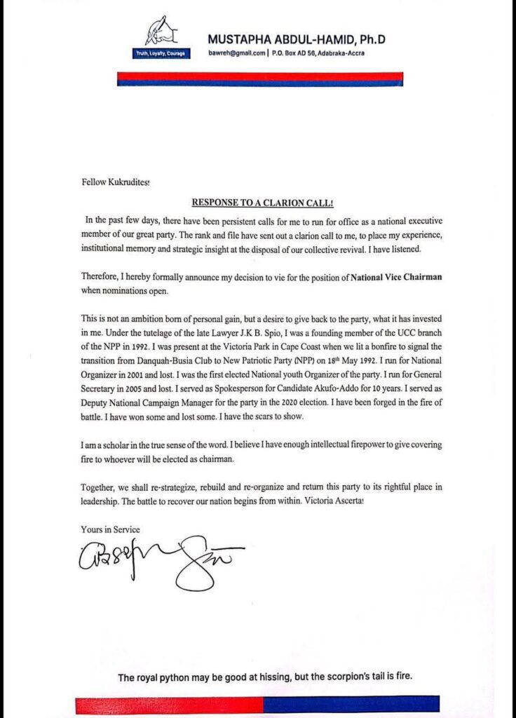Dr Mustapha Abdul-Hamid has officially declared his intention to contest the position of National Vice Chairman in the New Patriotic Party’s upcoming internal elections.