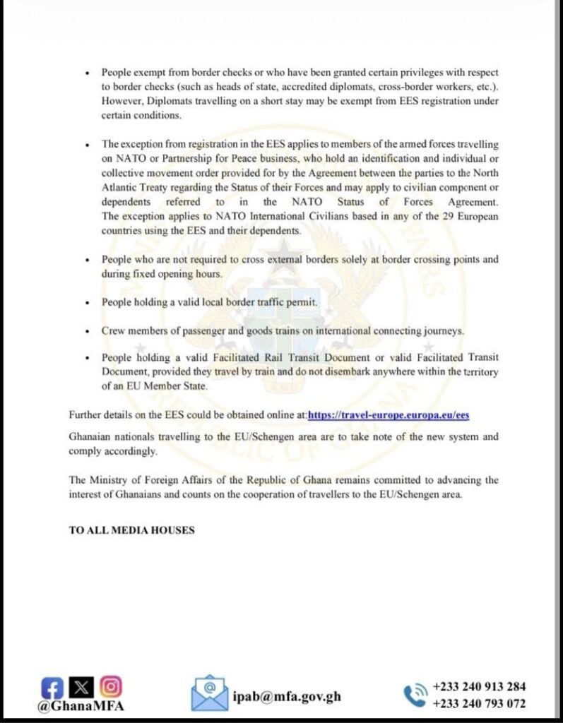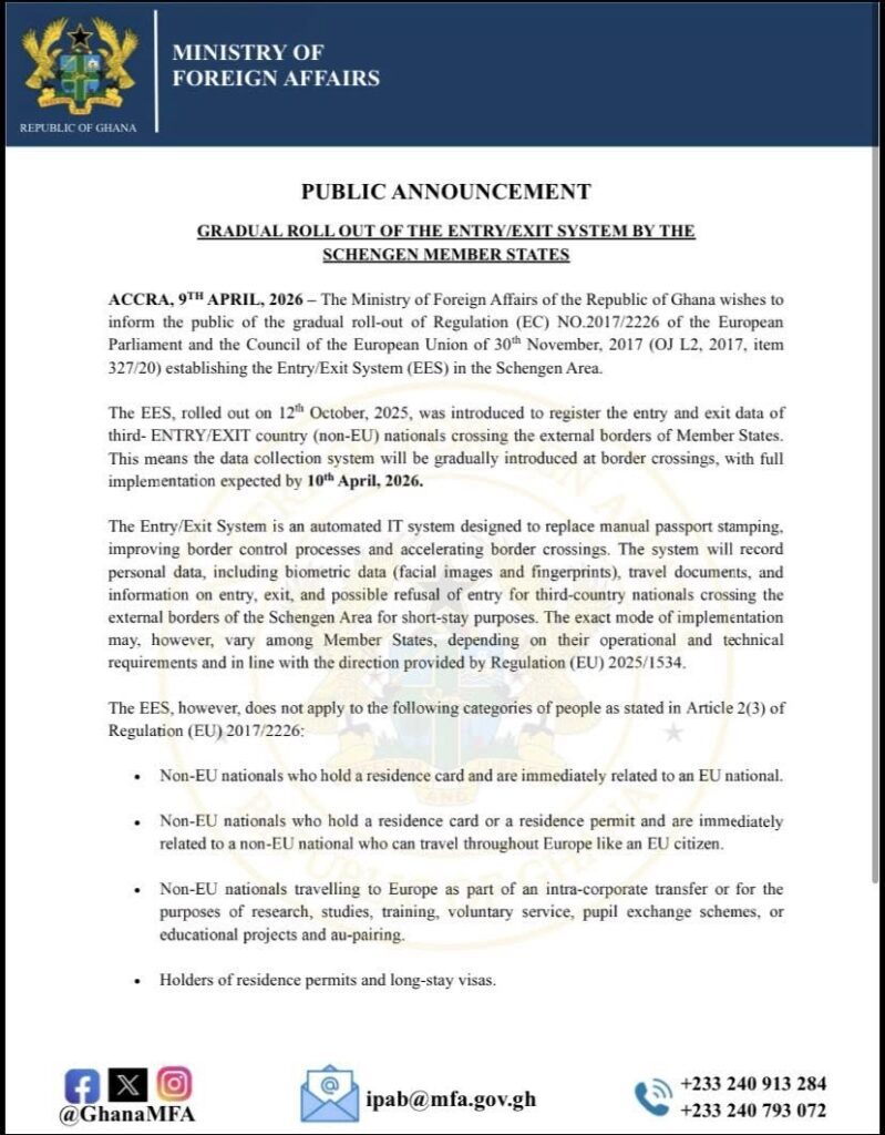 The Ministry of Foreign Affairs and Regional Integration has issued a formal notice to the Ghanaian public regarding the full implementation of the European Union’s Entry/Exit System (EES).