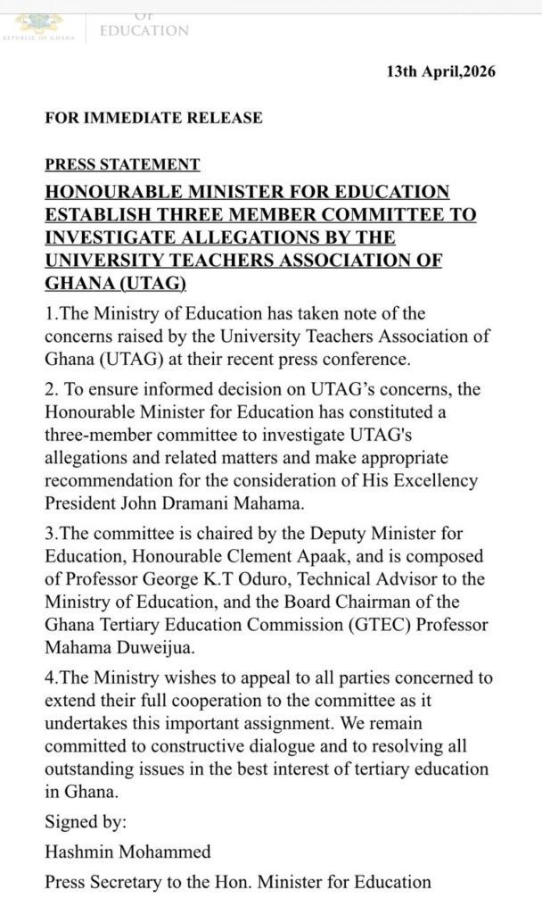 The Ministry of Education has established a three-member committee to investigate recent allegations made by the University Teachers Association of Ghana (UTAG).