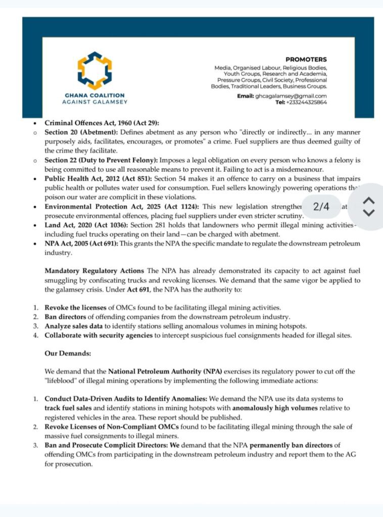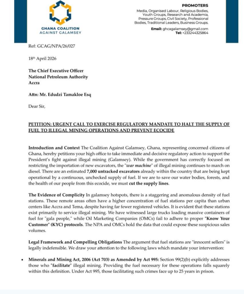 The Ghana Coalition Against Galamsey has issued a formal petition to the National Petroleum Authority (NPA), demanding an immediate halt to fuel supplies powering illegal mining operations across the country.