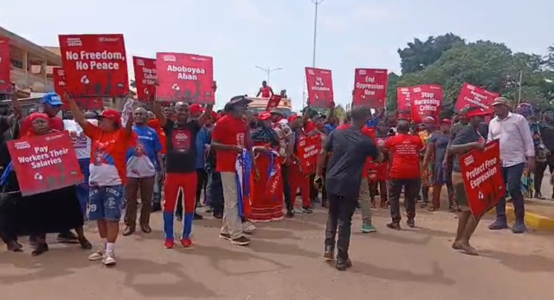 The New Patriotic Party (NPP) staged a protest on Wednesday, 22 April, in Sunyani to denounce alleged intimidation, harassment, and the suppression of free speech by the ruling government.