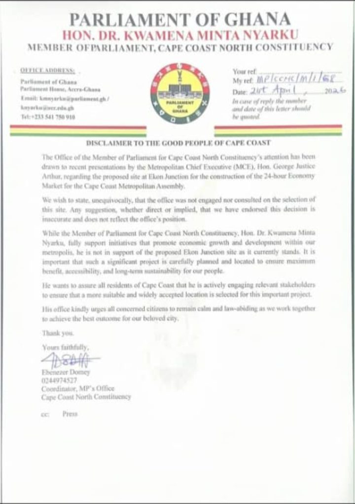 The Member of Parliament for Cape Coast North, Hon. Kwamena Minta Nyarku, has expressed displeasure over the Cape Coast Metropolitan Assembly’s handling of the proposed 24-Hour Market, saying he was not consulted on the choice of site before it was announced.