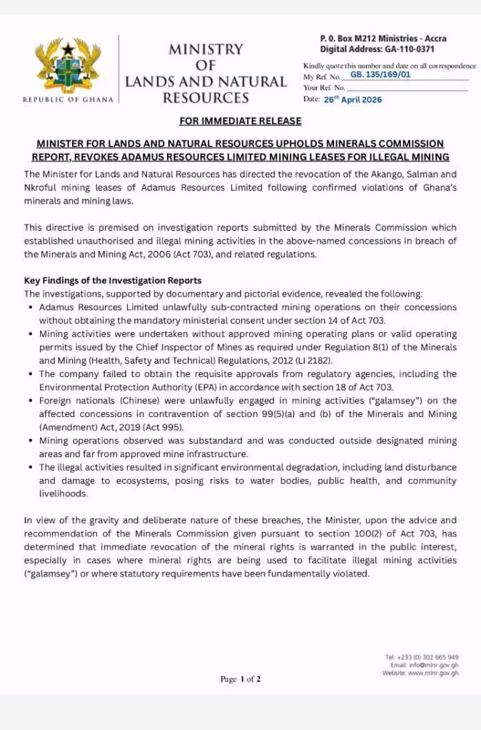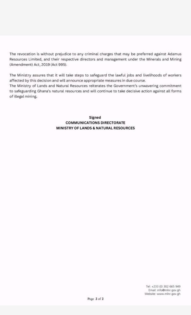 The Ministry of Lands and Natural Resources has officially revoked the mining leases of Adamus Resources Limited.