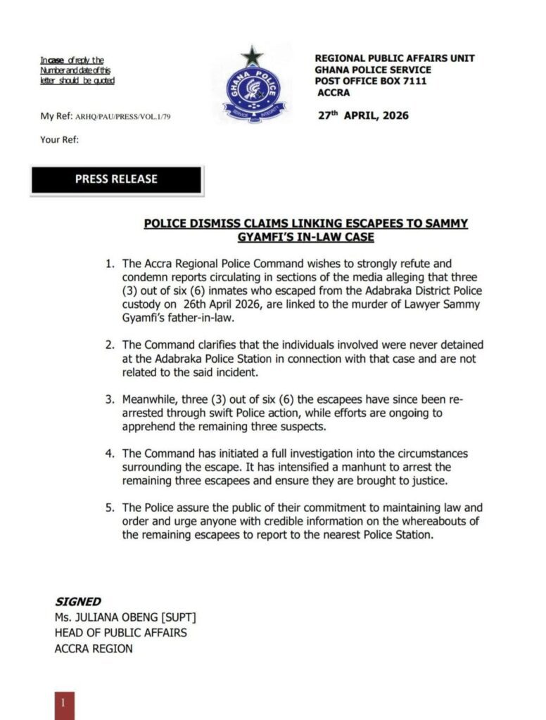 In an official statement released on April 27, 2026, the police addressed allegations that three of the six inmates who escaped custody the previous day were involved in the murder of politician Sammy Gyamfi’s father-in-law.